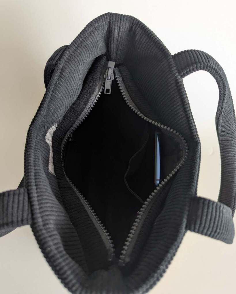 Le modèle Annie de Patrons Sacôtin est pourvu de 3 poches : une poche zippée à l’arrière, une poche zippée à l’intérieur et une poche plaquée pour le téléphone portable. Cependant, dans ce cas, j’ai décidé de ne pas inclure la poche zippée à l’arrière afin de me faciliter la tâche.
