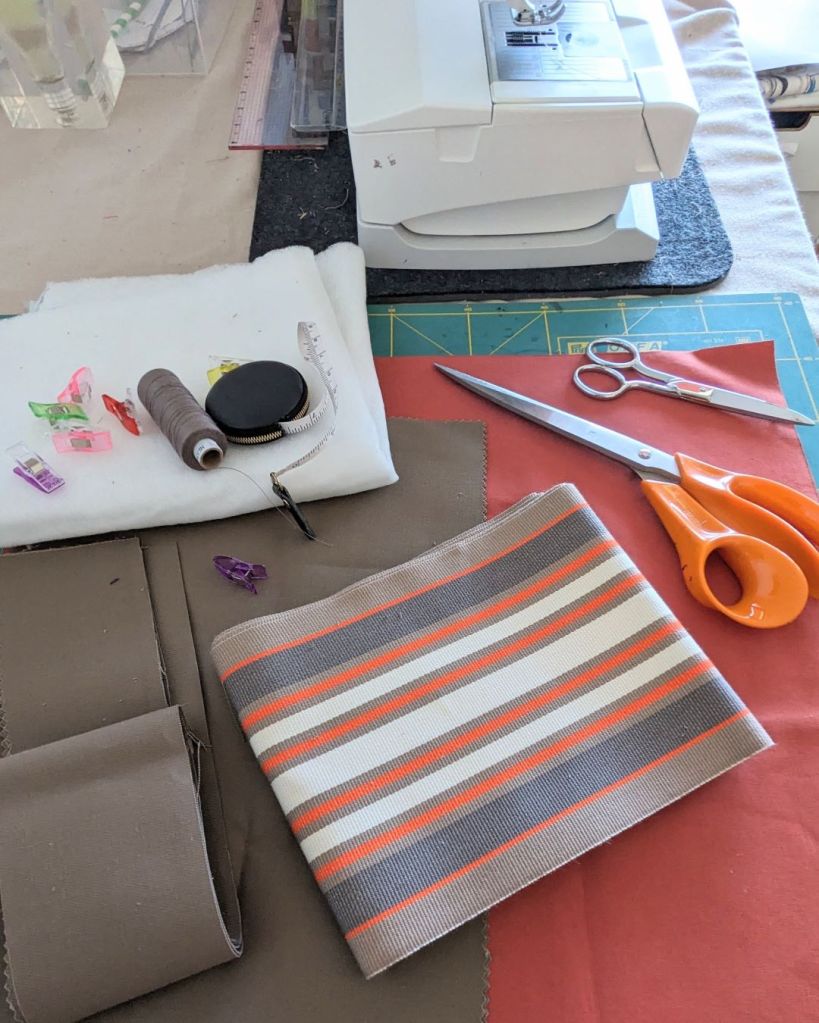 Je ne pouvais pas résister à l’envie d’y intégrer un morceau de mon tissu fétiche : la toile basque . Ici, toile espadrille « Enéko Potiron » de chez Lartigue 1910, une maison emblématique du Pays basque. Sa qualité, ses rayures lumineuses et son histoire textile m’inspirent toujours autant.