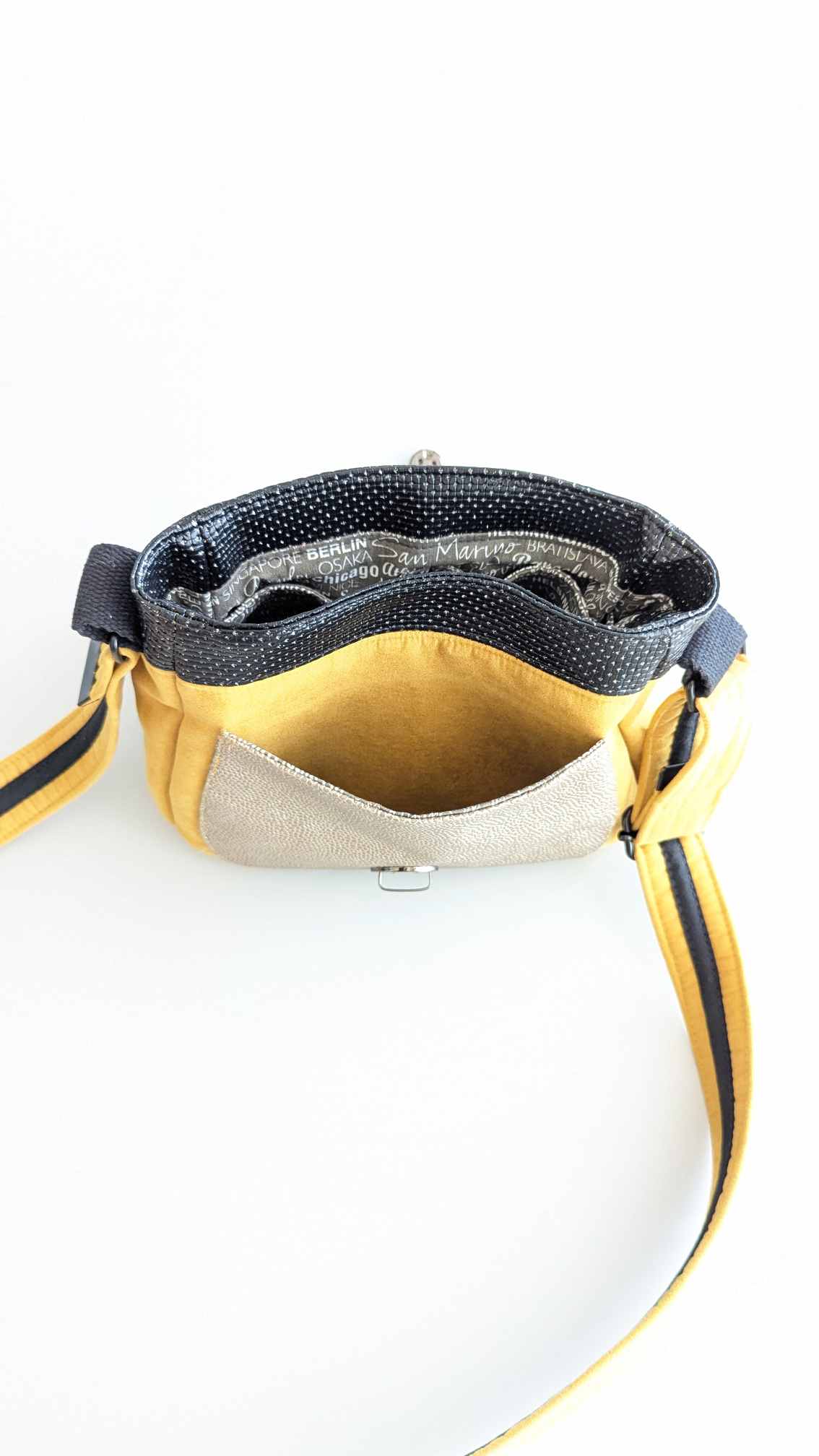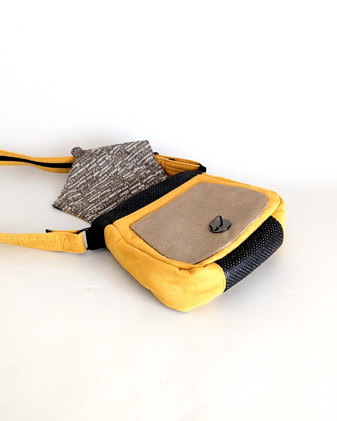 Le patron inclut plusieurs empiècements, offrant de nombreuses possibilités pour jouer avec les textures et couleurs. J’ai expérimenté en combinant suédine, simili grain doré et simili noir à strass pour obtenir un sac en tissu artisanal aussi élégant qu’original.